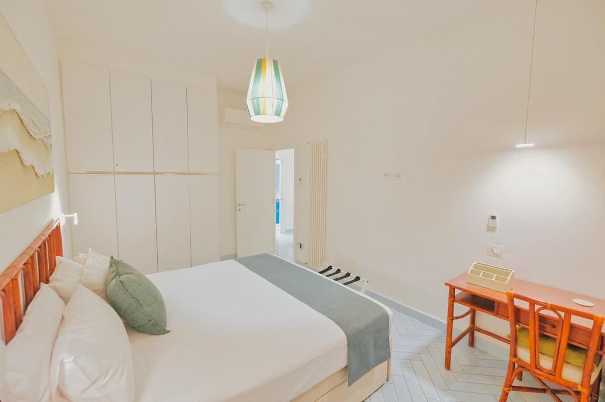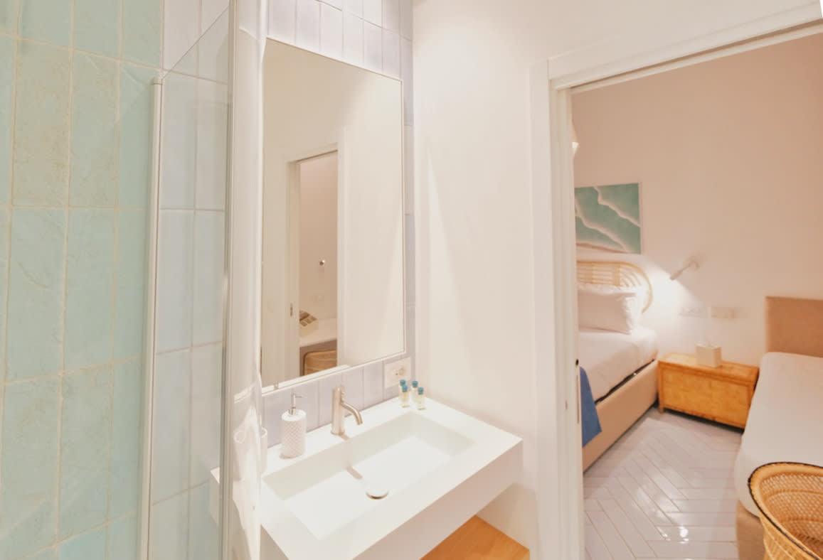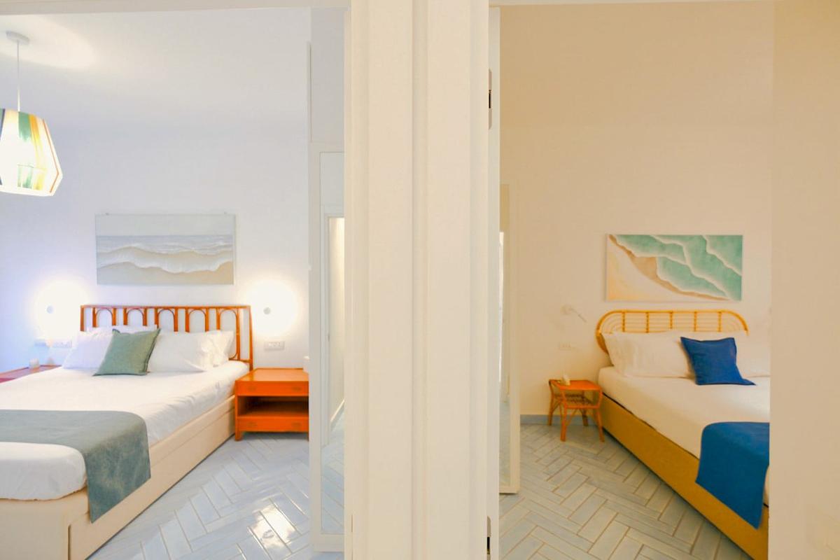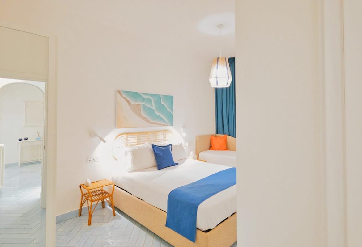 With 125 m² of elegance and space, this stunning apartment features two master bedrooms with Super King beds—one of which includes an additional single bed. Enjoy original Vietri terracotta floors, two full bathrooms, a spacious desk ideal for remote work, and a double private terrace with unparalleled sea views. You'll also have exclusive access to a rocky beach, shared only with other guests of the same resort.